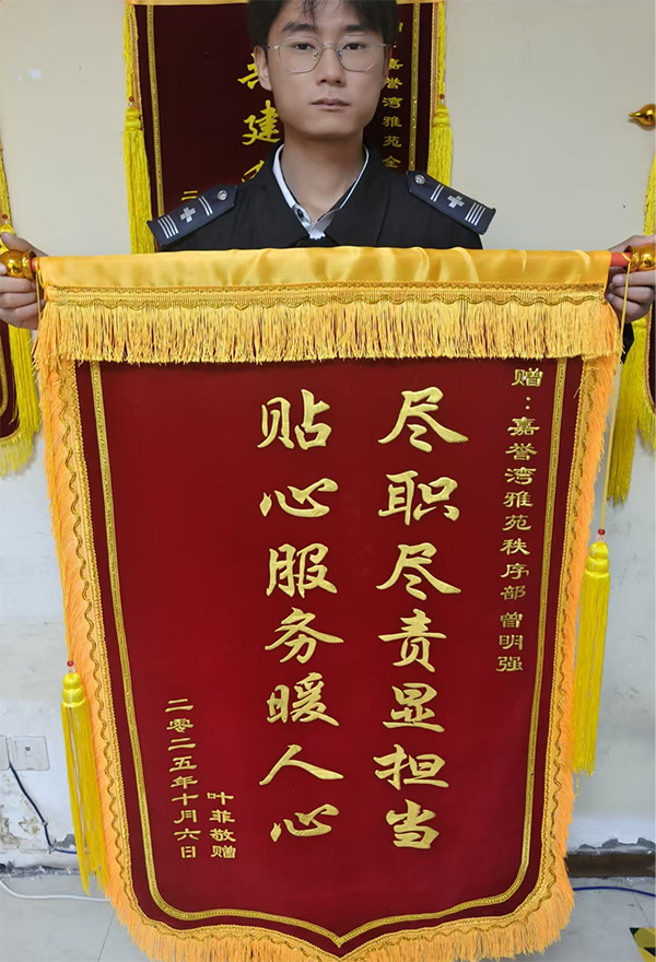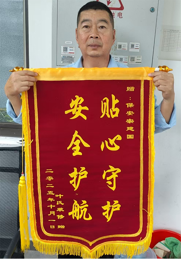 With this vigilance, Zong Jianguo immediately contacted the property management to verify and finally confirmed that there was a debt dispute between the workers and the decoration company. This visit was not a demand from the owners, but an attempt to pressure them on the grounds of construction. He decisively stopped the workers and promptly prevented any trouble and losses that could have caused the owners. Afterwards, the decoration company specially customized a banner to express gratitude and sent it to the gate, praising "thoughtful protection and safe escort".
